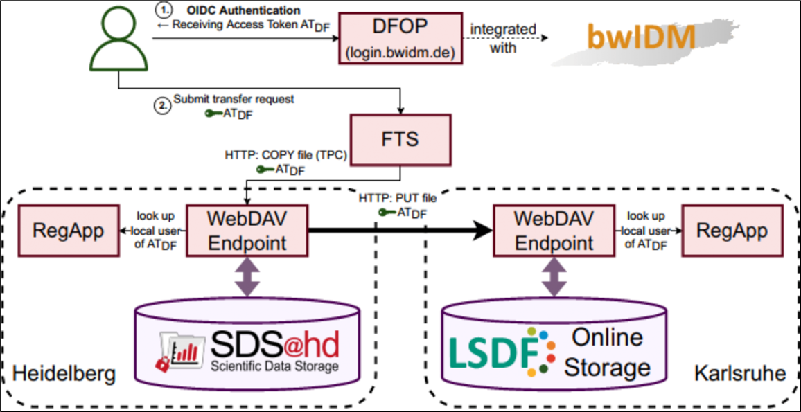 Für die Praxis relevanten Community-Funktionalitäten wurden am Use-Case "standortübergreifender Datentransfer" erprobt. Für die technische Implementierung wurde eine containerisierte Lösung eines WebDAV-Endpunktes umgesetzt, welche über OIDC/OAuth2 zur Authentifizierung und einer Rest-Schnittstelle zum Übersetzten des lokalen Users des Speichersystems auf eine Identität in bwIDM ermöglicht. Dadurch können nun standortübergreifende Datentransfers erfolgen, die User- und Gruppenberechtigungen im Quell- und Zielsystem berücksichtigen. Die Implementierung wurde bereits in Karlsruhe und Heidelberg erfolgreich an verschiedene Speicherdienste angebunden und wird anderen Standorten für die Nutzung bereitgestellt. Diese Technologie ist beispielsweise für Zugriffe auf die Landesdienste LSDF Online Storage, bwUniCluster, Horeka und SDS∂hd im Einsatz und wird aktuell ebenfalls für den bwForCluster Helix umgesetzt. Erste Benchmarks von Datentransfers, die über den File-Transfer-Service (FTS) durchgeführt wurden, bestätigten die technische Reife; die Skalierung auf weitere Standorte und Systeme erfolgt im Partnerprojekt bwHPC-S5.
